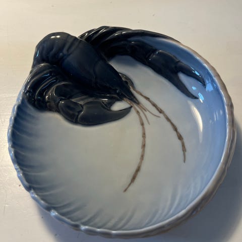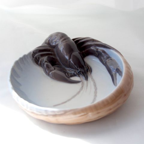 Porcelænsskål med hummermotiv. Skålen har rund form med rillet kant og er dekoreret med en grå hummerfigur, der går ind over den indvendige side. Farverne er overvejende hvide og grålige nuancer. Velegnet som dekorationsskål eller til servering af mindre anretninger.Royal Copenhagen