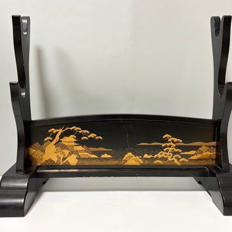 Et forfinet træsværdstativ indlagt med smukke blomster, ældre figurer, flyvende fugle, græs og grantræ, lavet af perlemor med fremragende håndværk, som kan rumme tre sværd samtidig.