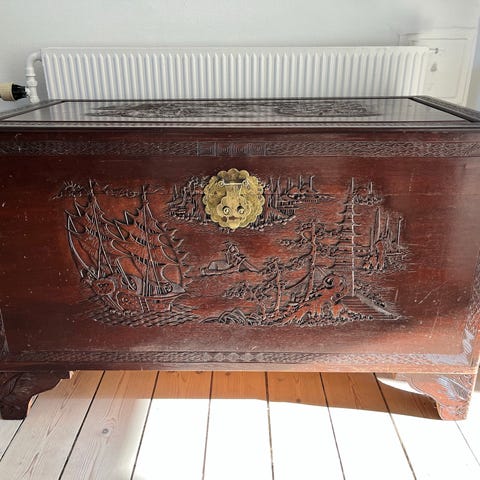 Meget smuk småkiste modeleret efter Shinmon-porten ved indgangen til et japansk helligdom, trægenstand fra Japan fra Shōwa-perioden (1926–1989), målene 32,0 × 39,8 × 17,1 cm, uden stand, i god stand med tre rækker skuffer og hængslede døre. Klik på den blå "gå til varen" knap, for at købe eller byde på denne vare. Den samlede pris vil blive vist inden du afgiver dit bud.