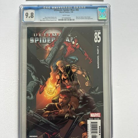 Engelsk-sproget første udgave af Ultimate Spider-Man, graderet CGC 9.8, nr. 77 Hobgoblin og Nick Fury, hæftet binding, kunstnere Richard Isanove, Mark Bagley, Scott Hanna og Brian Michael Bendis, udgivet af Marvel Comics i 2005. Klik på den blå "gå til varen" knap, for at købe eller byde på denne vare. Den samlede pris vil blive vist inden du afgiver dit bud.
