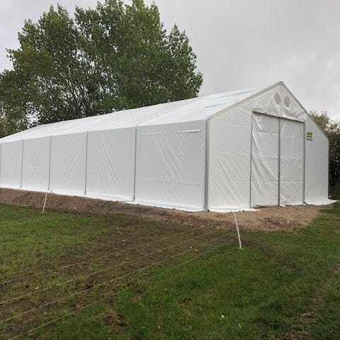 Køber skal selv nedtage og læsse telthallen, der er ikke rampe eller anden hjælp til rådighed.