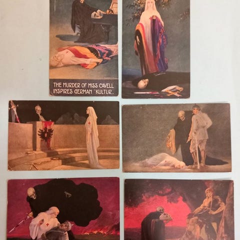 Louis de Raemaekers serie af 31 originale postkort fra Første Verdenskrig, anti-tysk propaganda, til det italienske marked med tosproget tekst (italiensk og fransk), Rejs ikke, mål 14x9 cm, sjældne.