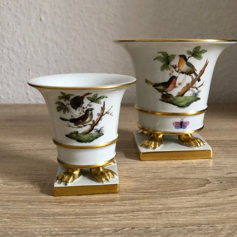 To Herend porcelænsvaser i Apponyi Porpora-design fra Ungarn, fra 1970–1980, i nærmest ny stand, den ene vase er 14,5 cm høj med diameter 17 cm, den anden 12 cm høj med diameter 14 cm. Klik på den blå "gå til varen" knap, for at købe eller byde på denne vare. Den samlede pris vil blive vist inden du afgiver dit bud.