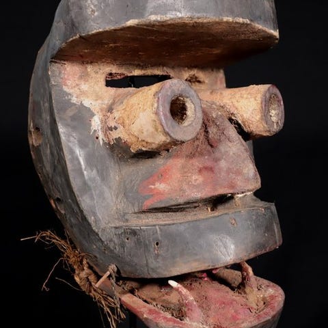 Antik Guere krigsmaskine fra Elfenbenskysten, træ, 29 cm × 19 cm, vægt 0,99 kg, dateret 1900–2000, i god stand med tegn på ældning og brug. Klik på den blå "gå til varen" knap, for at købe eller byde på denne vare. Den samlede pris vil blive vist inden du afgiver dit bud.