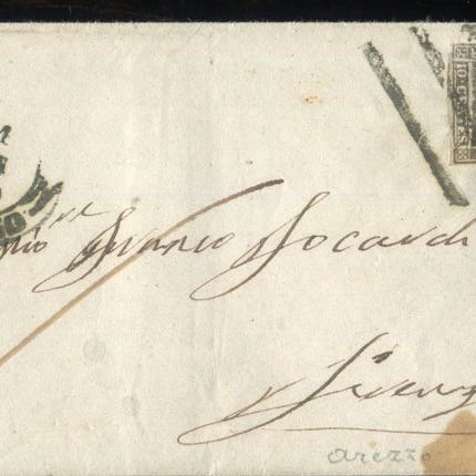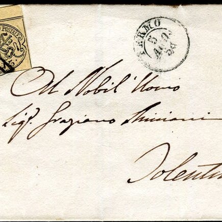 Breve fra Castel San Giovanni 13. september 54 til Milano, frankeret 5 og 10 centesimi 1. udgave. Takst for den første afstand 'lega'. God annullering vurderet til 5 point. Frisk sammen med frimærker i perfekt stand. Certificeret af Dr. M. Manzoni. Katalogværdi € 2250,00