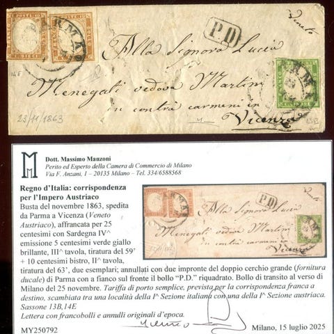 Oprindelse: Antikke italienske stater – Parma; Titel: Affrancatura bicolore 1° emissione; Tilstand: Brugt til post med adresse, certificeret af Dott. M. Manzoni, 1852. Klik på den blå "gå til varen" knap, for at købe eller byde på denne vare. Den samlede pris vil blive vist inden du afgiver dit bud.