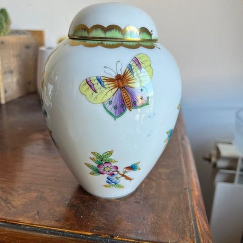 Herend porcelænsfremhævet beholder fra Ungarn, vintagestil 1960–1970, cremefarvet med lyserøde og gyldne detaljer, 10 cm højde, 10 cm bredde, 10 cm dybde, 200 g, i ubrugt stand. Klik på den blå "gå til varen" knap, for at købe eller byde på denne vare. Den samlede pris vil blive vist inden du afgiver dit bud.