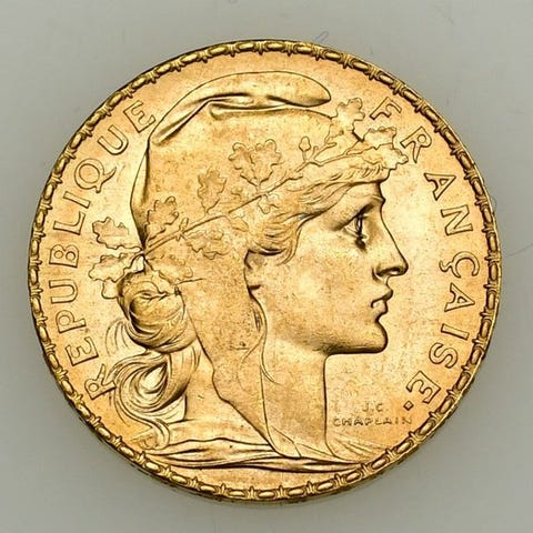 Fransk 20-francs mønt fra 1910, guld 900/1000, vægt 6,45 g, ugraderet. Klik på den blå "gå til varen" knap, for at købe eller byde på denne vare. Den samlede pris vil blive vist inden du afgiver dit bud.