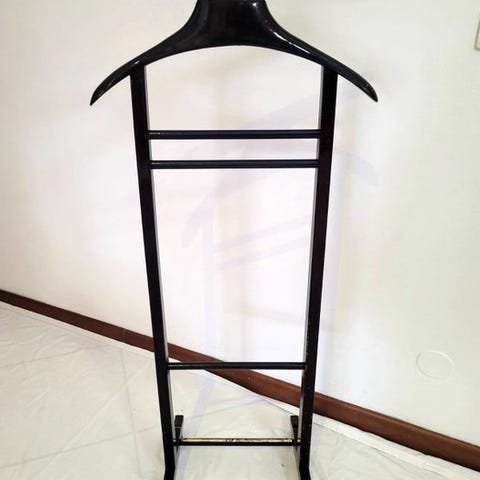Elegant vintage servomuto fra Fratelli Reguitti, ikon inden for italiensk design i 1950’erne og 1960’erne. Fremstillet i førsteklasses træ, kombinerer en jakkehænger, en lille bakke til tømning af lommer og en frontpres for at holde buksernes presseform, alt sammen autentificeret af det berømte trykte mærke, der garanterer den håndværksmæssige kvalitet.