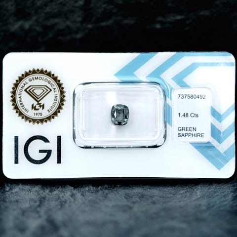 Safir, en enkelt cushion-cut ædelsten på 1,77 ct, farve grågrøn/blå, ubehandlet, med ALGT-rapport nr. 37125177. Klik på den blå "gå til varen" knap, for at købe eller byde på denne vare. Den samlede pris vil blive vist inden du afgiver dit bud.