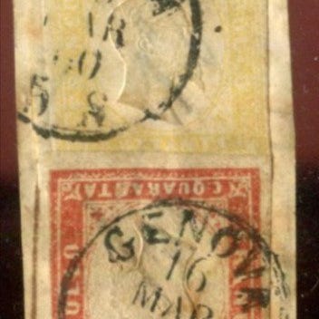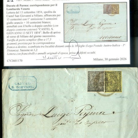 Et eksemplar af 15 centesimi håndlavet papir, 1. udgave med det yderst sjældne stempel "CASAL.MAGE" vurderet til R2 point. Eksemplaret er friskt og margineret, af fremragende udseende, men defekt. Et af Lombardo Veneto’s mest sjældne stempler, vurderet til R2!!! Certificeret af Dr. M. Manzoni. Katalogværdi € 10080,00.