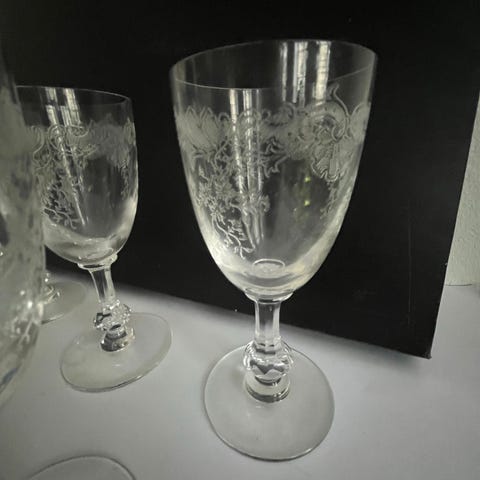 Alle stykker er i fremragende stand. Et glas har en meget lille intern mikrodefekt, knap synlig og kun synlig ved tæt inspektion (venligst se billederne). Overordnet klarhed og kvalitet forbliver fremragende og afspejler fuldt ud arven og savoir-faire fra Saint-Louis-fabrikken.