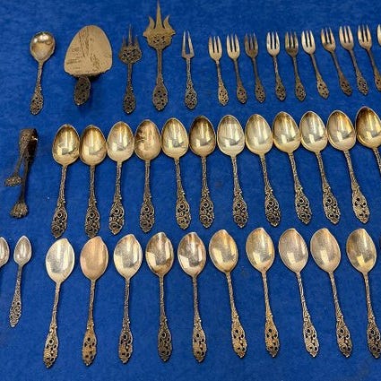 Bestikket ligger i de originale æsker undtagen dessertskeer og kagegaffler.