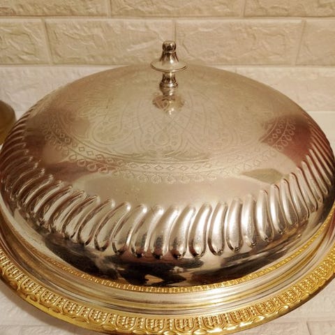 Et sølvfad i 1000-sølv og i perfekt stand, med håndtagene, og kanterne er fuldstændigt broderede med smukke mønstre.