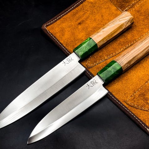 Specialfremstillet rustfrit stål (12C27) 2-delt køkkenknivsæt med resinhåndtag og læderskede (rullepose)