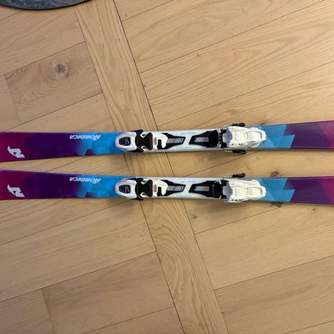 LÆKRE Pink børneski med tilhørende skistave. Skiene er 115 cm lange og udstyret med justerbare bindinger. Skistavene er 90 cm lange. Sættet er egnet til børn og kan bruges til almindelig alpinski på pister.