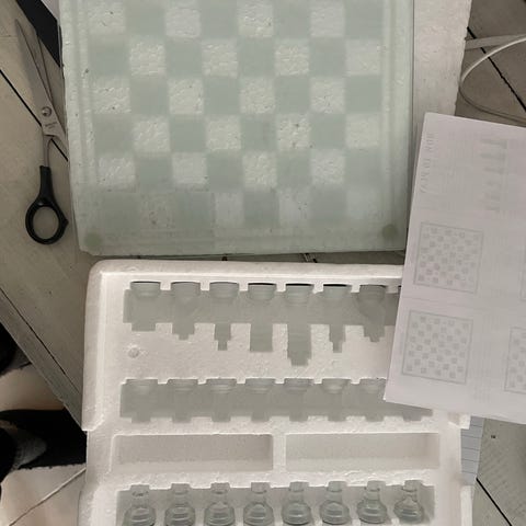 Flot skak spil hvor de to sæt brikker er udført i henholdsvis klart og mat glas.
