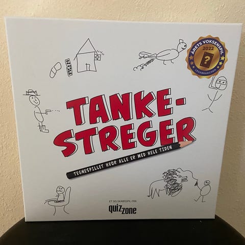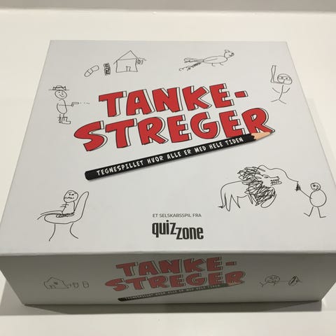 QuizZone Tankestreger. Spillet består af en spilleæske med tegneblok, kort og tilbehør til at tegne og gætte begreber. Egnet som selskabsspil for flere deltagere, hvor spillerne tegner og forsøger at gætte hinandens illustrationer.
