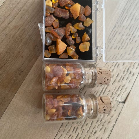 Rå ravstykker i alskens farver og størrelser. Ligger på papir, hvor de mindste firkanter er 1 x 1 cm. Afhentes eller kan sendes med dao for 45 kr. uden omdeling.