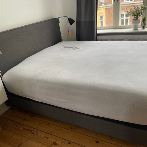 IKEA sengestel med sengegavl i grå tekstil. Sengen består af en polstret ramme med trælameller samt en separat polstret sengegavl i matchende grå farve. Stellet står på ben i mørkt træ eller trælook. Velegnet til brug med standard madras i tilsvarende størrelse og kan anvendes i soveværelse eller gæsteværelse. Ingen madras medfølger ud fra de viste billeder.