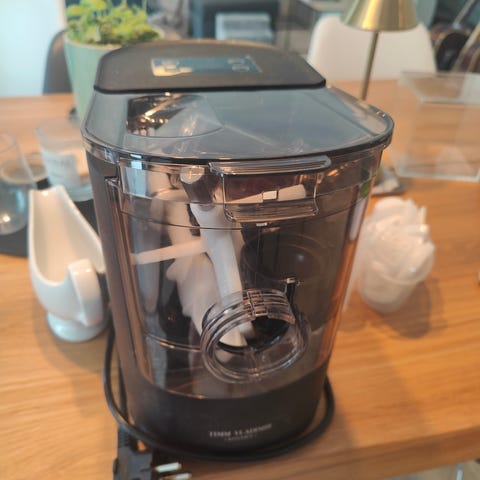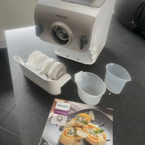 Philips pastamaskine med originalt tilbehør og brugervejledning. Mangler to målekopper fra den originale pakke. Maskinen har flere udskiftelige forme til forskellige typer pasta samt ekstra plastdel til rengøring. Enheden er egnet til fremstilling af frisk pasta i hjemmet. Manual på flere sprog medfølger, (DK, NO, EN, FI og SV).. Super fin stand, bliver bare ikke brugt. Nypris ca. 1500 DKK..