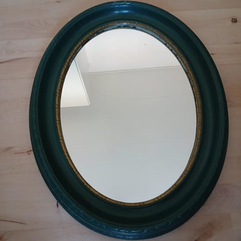Romantisk, ovalt spejl, af træ, hvidmalet. Hvidmalet i bondestil. Måler 50x75 og kan hænge lodret som vandret. Hillerød