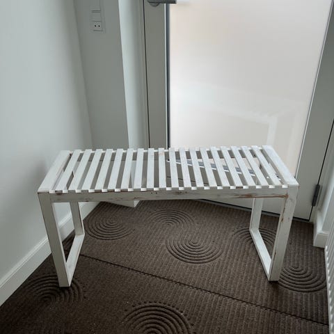 Sød bænk som vi har været glade for i entreen, men da vi har arvet et møbel, må bænken vige pladsen. 😊