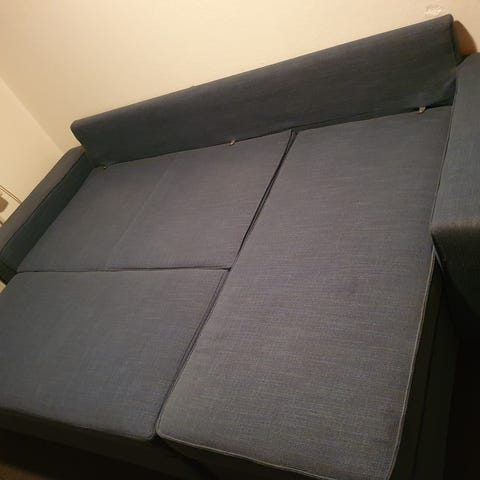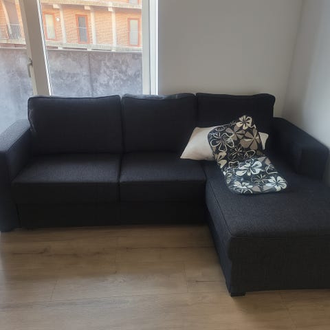 God sovesofa med chaiselong, under chaiselongen er der opbevaringsplads. Sælges da min datter ønsker sig en “rigtig” seng og derfor er pladsen der ikke til sofaen.