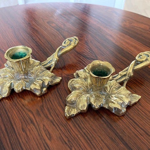 Et par yndige messing lysestager 🤎 Charmerende patina og spækket med detaljer. Sælges samlet til 350 kr.