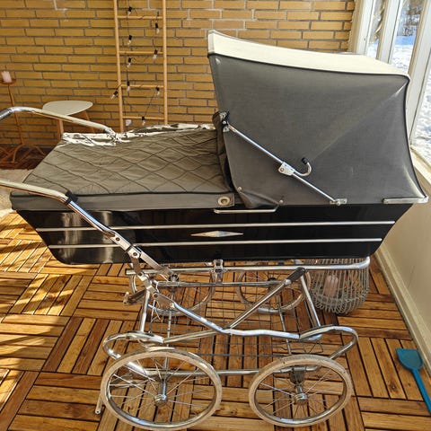 Odder barnevogn med sele lift madrasser og regnslag og fluenet og et sæt sengetøj