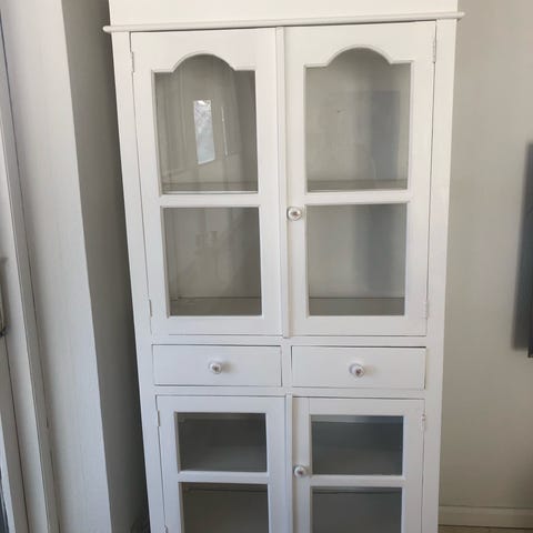To elegante vitrineskabe med glaslåger og spejlsider sælges. Skabene er hvide med fine messinggreb og glashylder – perfekte til opbevaring og fremvisning af service, glas, pynt eller samlinger.