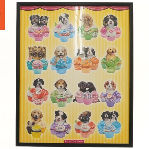 Dette billede viser en samling af forskellige hunde, hver placeret i en farverig cupcake. Billedet har en gul baggrund med striber og er indrammet i en sort ramme. Det er 52x42 cm i størrelse. Bagsiden af rammen har monteringsbeslag til ophængning på væggen. Dette er en dekorativ genstand ideel til vægudsmykning.