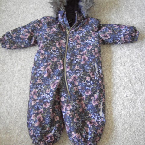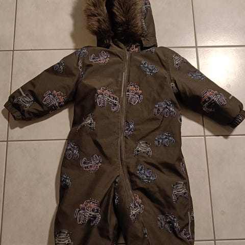 Heldragt til børn med et dinosaurprint. Dragten har en mørkeblå basefarve og er dekoreret med forskellige dinosaurer i forskellige nuancer. Den har en hætte og elastik ved håndled og ankler for at sikre bedre beskyttelse mod kulde.