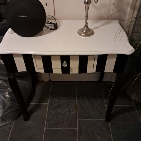 Konsolbord i træmosaik og stål. Nypris hos Bo Design er 5775 kr.