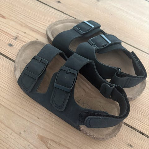 Next sandaler til børn, unisex model i størrelse 25. Åben sko med lukket tå, justerbar velcrolukning og kraftig gummisål. Farve blå med tekstiloverdel og mønstret ydersål, egnet til hverdagsbrug i varmt vejr.