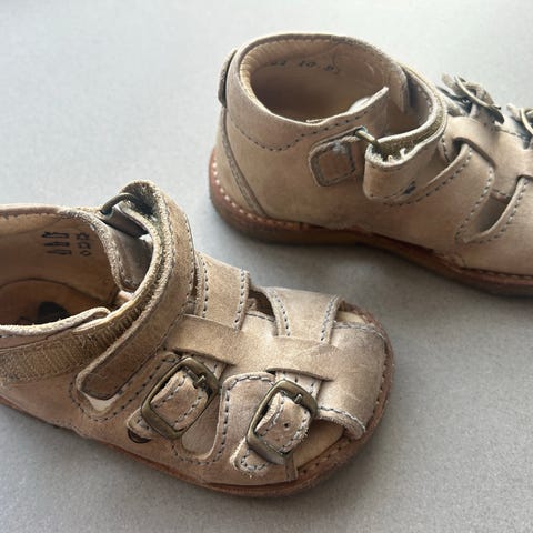 sandaler til børn, unisex model i størrelse 25. Åbne sandaler i læder med justerbare velcroremme over foden og omkring anklen. Overdel i læder med synlige stikninger og små metalnitter som detaljer. Indvendig læderforing og lukket hælkappe for ekstra støtte. Ydersål i slidstærkt materiale med mønster for bedre fodfæste. Egnet som hverdagssandal til børn, både til inde- og udendørs brug i varmere vejr.