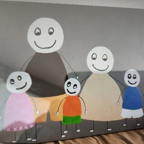 Hela maleri med motiv af fem musikere i farverige dragter. Billedet viser figurer, der spiller forskellige instrumenter, bl.a. kontrabas og blæseinstrumenter, på en lys baggrund. Maleriet er indrammet i en lys ramme. Velegnet som vægdekoration i stue, gang eller musikrum.