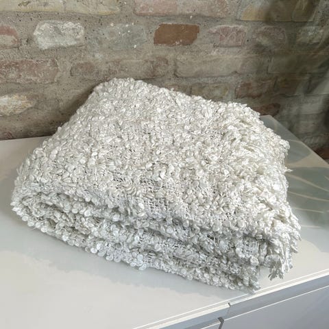 Super fint kugletæppe i lilla, hvid og pinke nuancer. Måler 90 cm. Kan leveres op langs E45 til og med Aarhus.