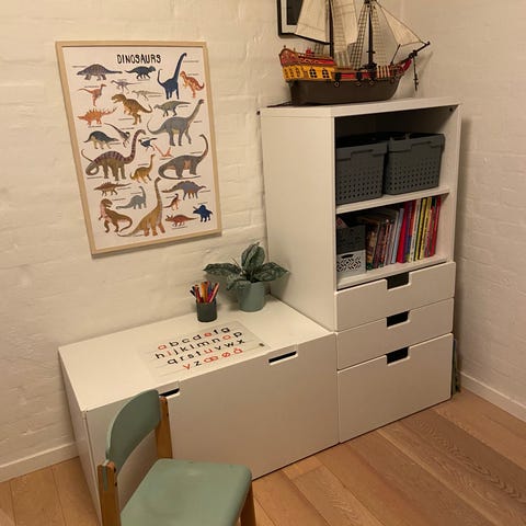 IKEA børnemøbel opbevaringsmodul med skabe og bænk i rosa og hvid. Sættet består af flere enheder med skabe, hylder og rummelige opbevaringskasser. Den ene del fungerer som bænk med polstret siddehynde, og de øvrige dele har låger og udtræk til legetøj, tøj eller andre børneting. Overfladerne er i lyserød og hvid med enkle greb, og indretningen giver mulighed for organiseret opbevaring på børneværelset.