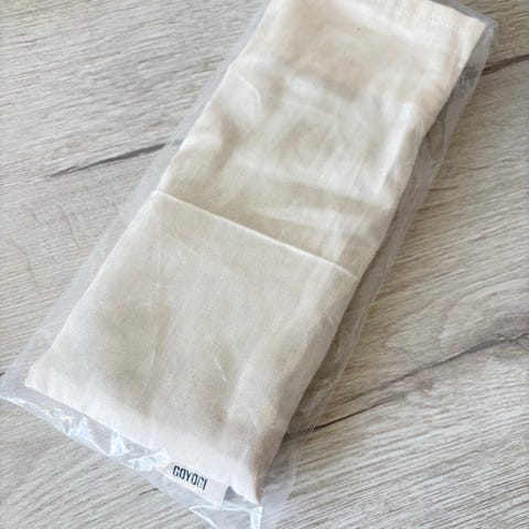 Øjenpude i mørkeblå silke med påtrykt om-symbol. Puden er formet til at dække øjnene og kan anvendes til afspænding, meditation eller hvile. Velegnet til brug derhjemme, i yogastudie eller på rejser, hvor der ønskes afskærmning for lys. Yderstoffet er aftageligt og vaskbart.