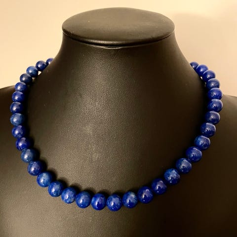 Smuk dobbeltradet halskæde af runde polerede lapis lazuli perler i forløb. L 57 cm og sølvlås stemplet 925 og mestermærke. Købt i 1980’erne og ikke brugt.