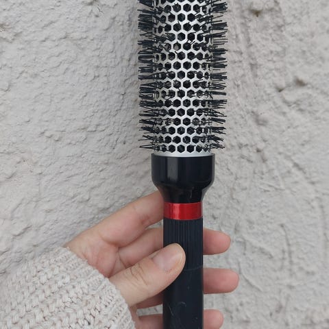 En rund hårbørste designet til styling og hårtørring. Den har et træhåndtag og er udstyret med børstehår, der er placeret rundt om hele cylinderen. Børstens længde er 23 cm, og den er velegnet til at skabe volumen og krøller i håret.