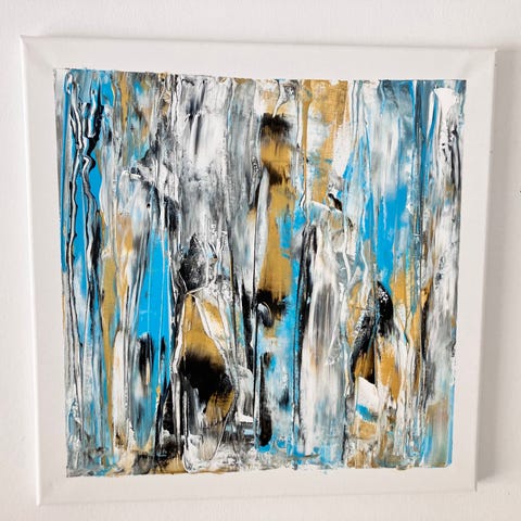 Abstrakt maleri 80x100 på lærred i lyse nuancer med hvid baggrund og detaljer i turkis, guld og beige samt sorte konturlinjer. Maleriet er opspændt på en træramme, klar til ophængning. Velegnet som vægdekoration i stue, kontor eller andre opholdsrum, hvor der ønskes et moderne, abstrakt udtryk.