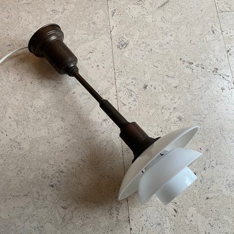 Vintage Louis Poulsen pendel i bruneret messing med skriften “patented” og “2”. Hvid opal glas diameter 20 cm.