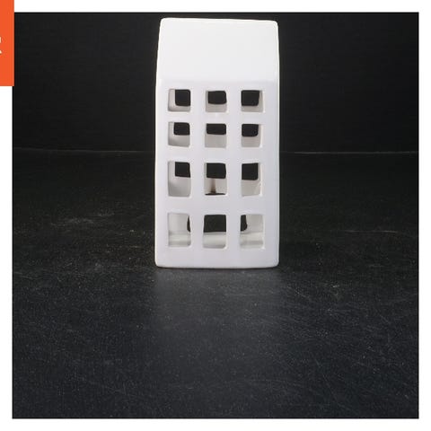 Keramik dekorativ hus formet som en lysestage med vinduer, der tillader lys at trænge igennem. Huset er i en brunlig farve og måler 24x13x9 cm. Detaljerne er indgraveret, inklusive vinduer og dør. Lysestagen har en åbning i bunden til at indsætte et lys. Mærkat i bunden indeholder produktinformation.