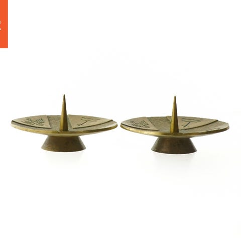 To lysestager lavet af messing med en dekorativ kant og udskårne mønstre af stjerner og hjerter. Den ene stager måler 7x8 cm, og den anden måler 5,5x7 cm. Bagsiden har prislapper og tegn på brug. Messingmaterialet giver en flot og klassisk finish til indretningen.