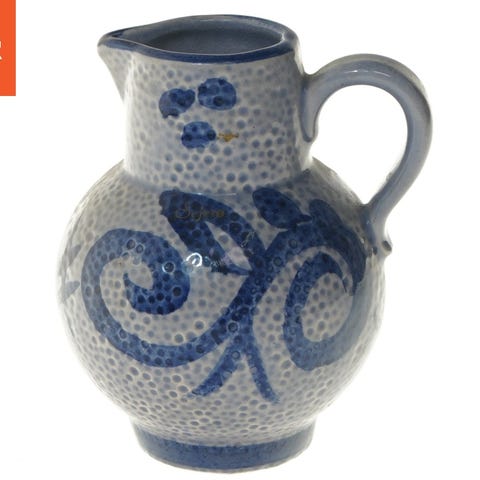 En grøn keramikkande med en rund, buet krop og en en enkelt hank. Kanden har en tud for nem opskænkning. Dens størrelse er Ø 9x10 cm, hvilket gør den passende til små portioner væske som mælk eller fløde. Kanden har en blank finish på ydersiden.