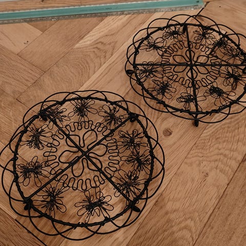 Et sæt af 6 bordskånere som måler 36 cm hver i diameter. Designet ligner en blomst og har en detaljeret dekoration med perler, som giver et elegant udseende. Bagsiden er ensfarvet grøn og ser ud til at være lavet af et blødt materiale. Bordskånerne er ideelle til at beskytte din bordoverflade samtidig med at tilføje en decorativ detalje til din indretning.