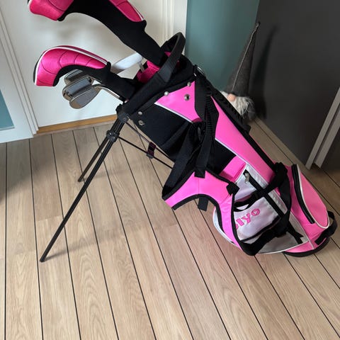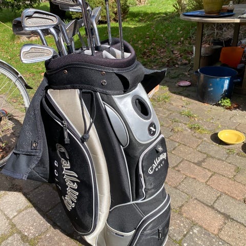 Ældre golfsæt til begyndere. Der er tre køller og 3-9 jern + pitching wedge