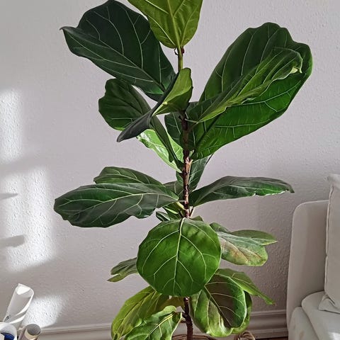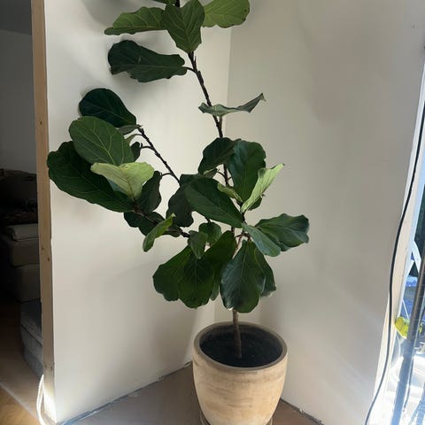 Stueplante af typen violinfigen (Ficus lyrata) i potte. Planten har flere høje stammer med større grønne blade foroven. Egnet som indendørs plante i stue eller kontor. Leveres i potte som vist på billederne.